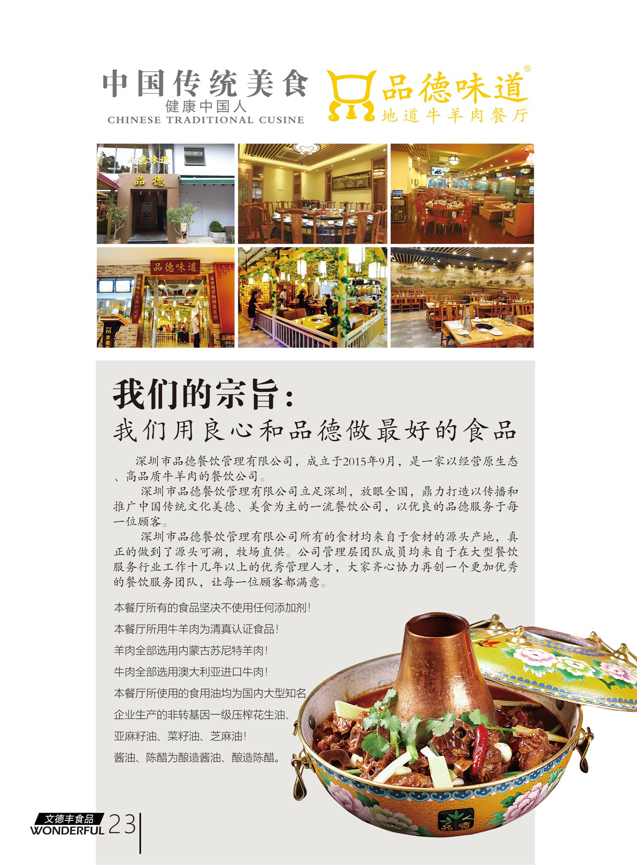 品德味道是文德豐旗下直營餐廳,成立于2015年底,位于深圳市福田區(qū),是一家以經(jīng)營傳統(tǒng)牛羊肉火鍋、燒烤類牛羊肉產(chǎn)品為主題的特色連鎖餐飲公司。公司依托文德豐商貿(mào)公司的產(chǎn)品源頭價格優(yōu)勢、文德豐食品公司中央廚房加工配送能力,形成了完整的供應(yīng)鏈體系。食材衛(wèi)生、標準化程度高、所有原輔料源頭可溯,完成符合國家對餐飲的監(jiān)管要求,為未來餐飲連鎖店及線下體驗店的發(fā)展打下了良好的基礎(chǔ)。