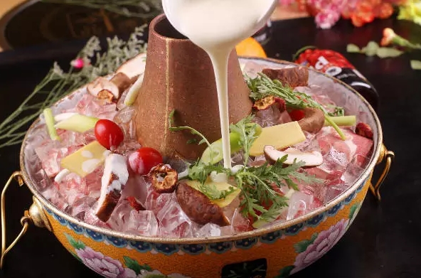 2.把提前準備好的冰塊拿出來,鋪在加過水的鍋底,冰面上再鋪上切好的羊肉塊。