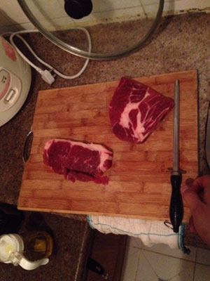 1.將買回來的冷凍牛排自然解凍,用紙巾或毛巾將牛排 3. 用磨刀的棍或是刀背捶打牛排,不要用太大的力,