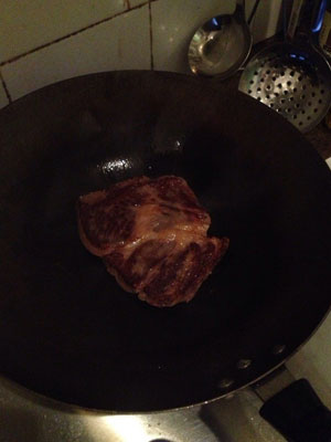 7.鍋內(nèi)放一點(diǎn)油,猛火燒熱鍋,待溫度上來后放入牛排,這時(shí)鍋內(nèi)會(huì)有油爆聲,不要怕,一直讓牛排煎,千萬不要翻動(dòng),