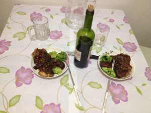 最后牛排出鍋澆上做好的蘑菇汁,倒上兩杯紅酒,就可以和自己心愛的人來享受這簡單而又美味的晚餐了。